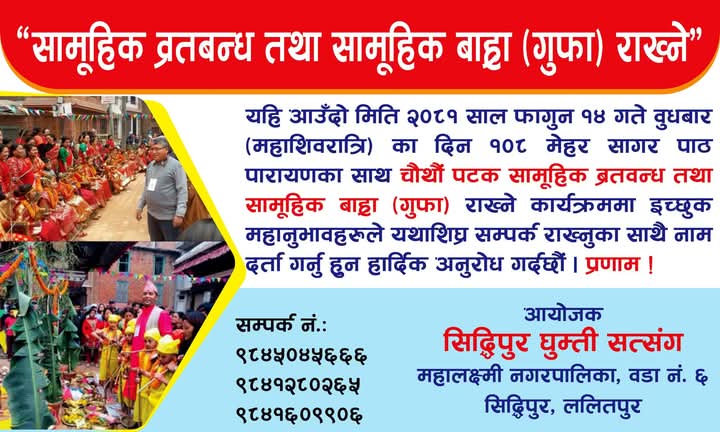 ललितपुर, माघ १७ काठमाण्डौं उपत्यका प्रहरी कार्यालय रानीपोखरीका प्रमुख प्रहरी अतिरिक्त महानिरीक्षक (एआइजी) टेक बहादुर तामाङको प्रमुख आतिथ्यमा चापागाउँ प्रहरी वृत्तमा पुनर्निर्मित भगवती मन्दिर तथा नवनिर्मित मन्दिर प्रवेशद्वारको समुद्घाटन सम्पन्न…