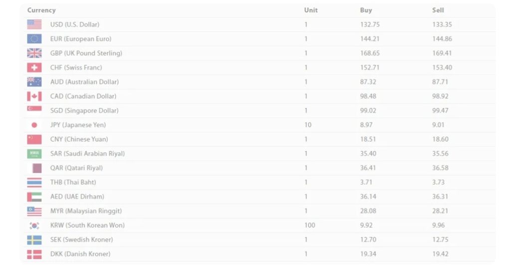 आज नेपाल राष्ट्र बैंकले विदेशी मुद्राको विनिमय दर तोकेको छ। अमेरिकी डलर एकको खरिद दर १३२ रुपैयाँ ७५ पैसा र बिक्री दर १३३ रुपैयाँ ३५ पैसा पुगेको छ।