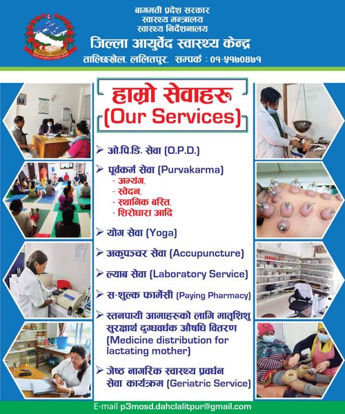 कार्यक्रममा जिल्ला आयुर्वेद स्वास्थ्य केन्द्रबाट ओपिडि सेवा, पञ्चकर्म/पूर्वकर्म सेवा, योगा सेवा, ल्याब सेवा, सशुल्क फार्मेसी, स्तानपायी आमाहरुका लागि मातृशिशु सुरक्षार्थ दुग्धवर्धक औषधि वितरण, राष्टसेबक कर्मचारीहरुलाई तनाब ब्यबस्थापन कार्यक्रमसहित ज्येष्ठ नागरिक स्वास्थ्य प्रवध्द्र्धन सेवा कार्यक्रम सञ्चालन भइरहेको जानकारी दिइयो ।