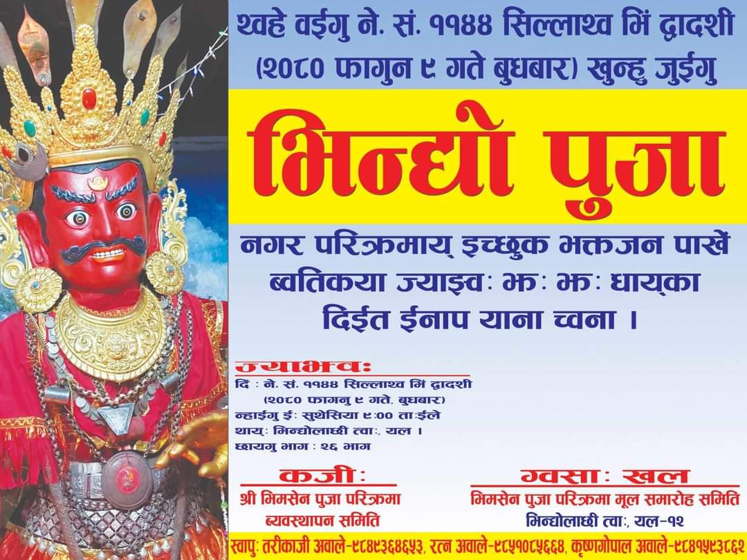 भिमसेन पूजा परिक्रम व्यवस्थापन समितिले आयोजना गरेको भिमसेन पूजा भाेलि पाटनको भिन्धोलाछिमा हुँदै छ ।