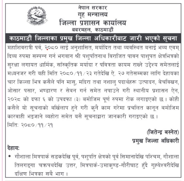 शिवरात्रि मेलालाई ध्यानमा राखेर जिल्ला प्रशासन कार्यालयमा भोलि फागुन २३ गतेदेखि ५ दिनसम्म पशुपतिनाथको मन्दिर आसपासको क्षेत्रमा मासु र मदिरा बेचबिखनमा निषेध गरेको छ।
