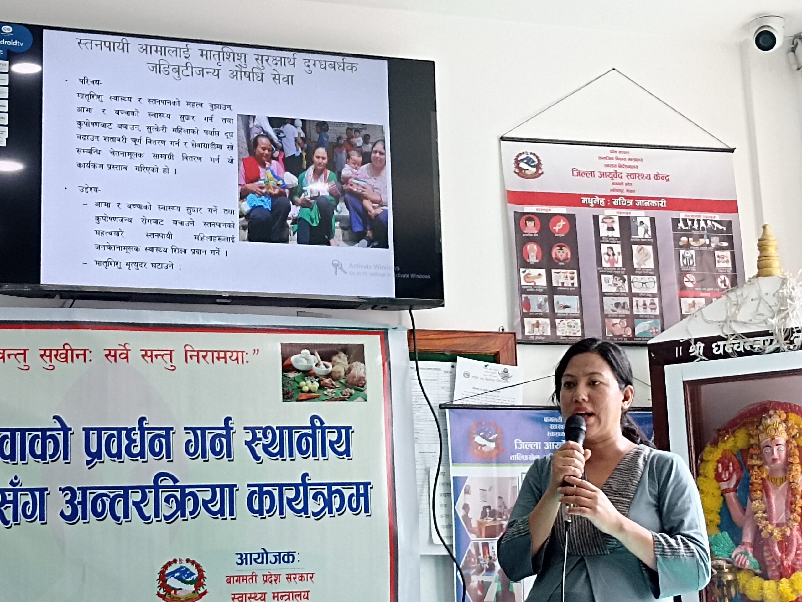कार्यक्रममा आर्थिक बर्ष २०८०/८१ आयुर्वेद स्वास्थ्य केन्द्र ललितपुरले गरेको सेवाको बारेमा कार्यालयकी प्रमुख डा. सृष्टि श्रेष्ठले जानकारी दिइन् । जिल्ला आयुर्वेद स्वास्थ्य केन्द्र ललितपुरले मुख्यमन्त्री जनता कार्यक्रम, महिला स्वास्थ्य स्वयंसेविकालाई आयुर्वेद सम्बन्धी सचेतना कार्यक्रम, स्वस्थ्य जीवन प्रवर्धन कार्यक्रम, जिल्ला स्थित राष्ट्रसेवक कर्मचारीहरुलाई तनाव व्यवस्थापन तथा पूर्वकर्म सेवा लगायत कार्यक्रम सञ्चालन गरेको डा.सृष्टि श्रेष्ठले बताइन् ।