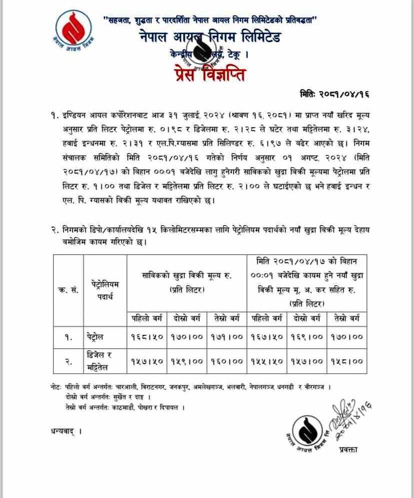 सरकारले इन्धनको मूल्य घटाएको छ । नेपाल आयल निगमले बुधबार राति १२ बजेदेखि लागू हुनेगरी मूल्य घटाएको हो ।