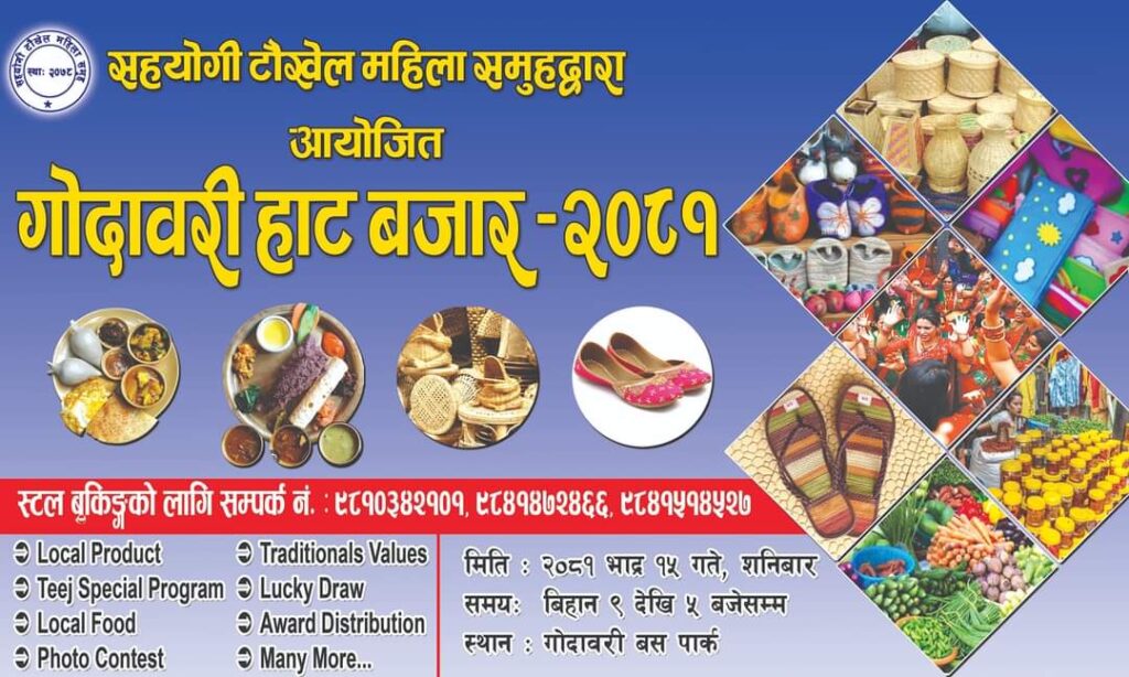 गाेदावरी बसपार्कमा भाेलि हाट बजार हुने भएकाे छ । सहयोगी टाैखेल महिला समूहको आयाेजनामा हुन लागेकाे हाे । हाट बजारमा ७० स्टल बुकिङ भइसकेको सल्लाहकार सुनिता खड्काले जानकारी दिइन् ।