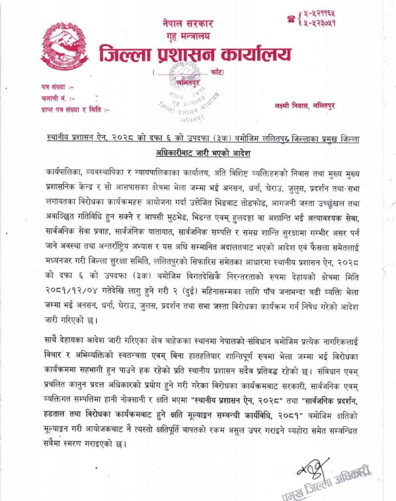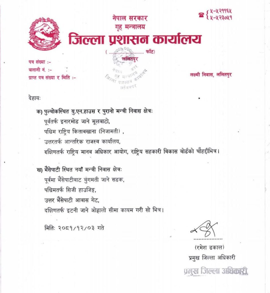 जिल्ला प्रशासन कार्यालय, ललितपुरले पुल्चोक र भैंसेपाटी क्षेत्रलाई निषेधित क्षेत्र घोषणा गरेको छ। पुल्चोकस्थित युएन हाउस, पुरानो मन्त्री निवास क्षेत्र तथा भैंसेपाटीको नयाँ मन्त्री निवास क्षेत्र आसपास निषेधित क्षेत्र तोकिएको प्रमुख जिल्ला अधिकारी रमेश ढकालद्वारा जारी आदेशमा उल्लेख छ।